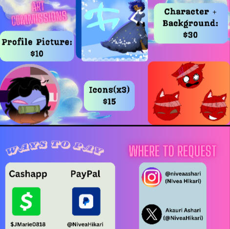 I started up art commissions to both improve my creative mind, and to make money. I'm currently in the process of finding a job, but I do want to have some money beforehand. All the details of what I am willing to draw are down below, along with prices, payment options, and two of my social media accounts to request from.